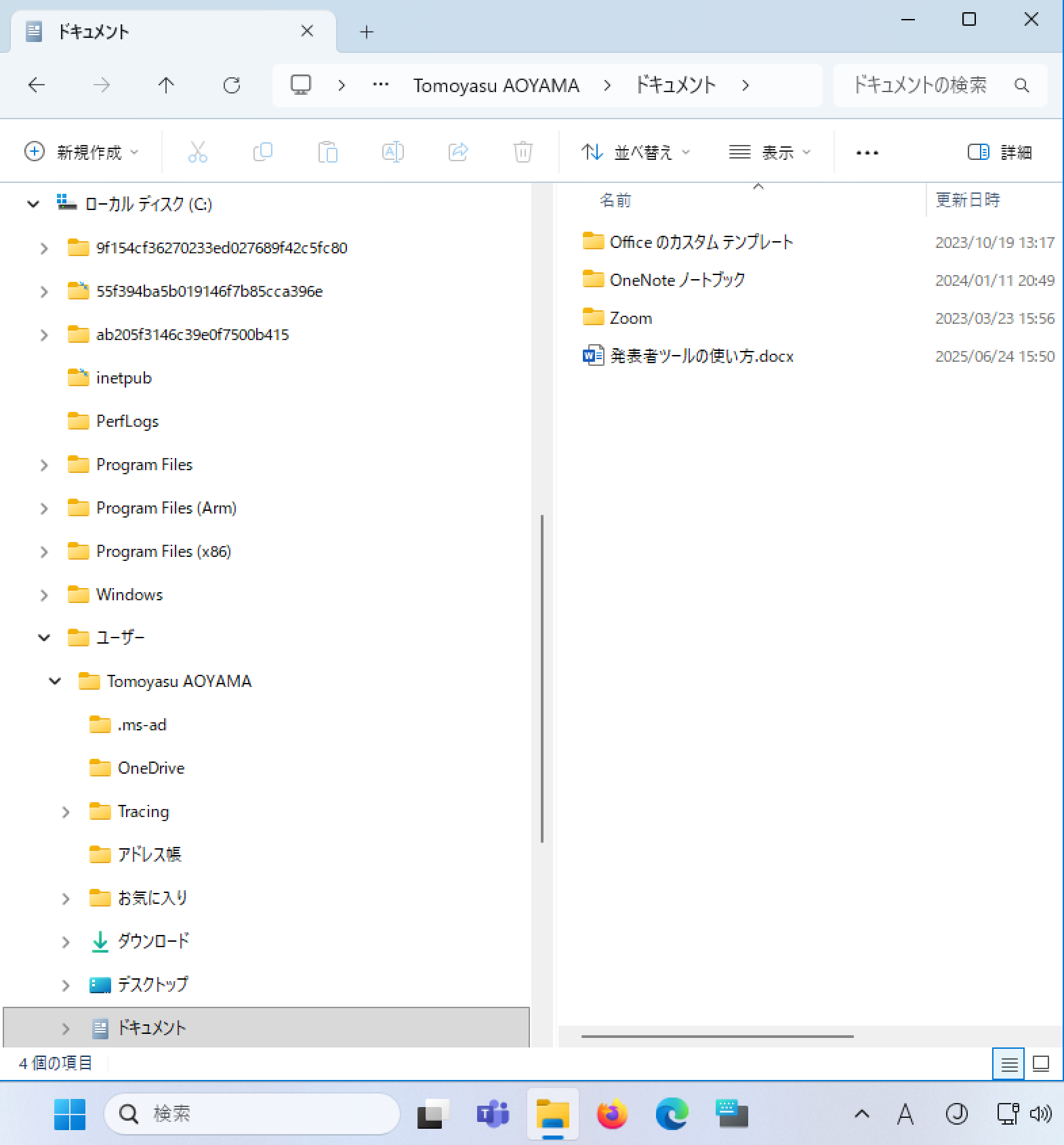 エクスプローラーの操作画面の左には「ナビゲーションウィンドウ」が表示されるが、Cドライブの左に表示される記号をクリックすると、Cドライブ内に配置されているフォルダーの一覧が少し右にずれて表示される。そのうちのひとつ「ユーザー」フォルダーの左にある記号をクリックすると、ユーザーフォルダー内に配置されているフォルダー(つまり、ユーザーのリスト)がさらに少し右にずれて表示される。これを繰り返していくと、フォルダーとファイルの階層構造が視覚化される(階層が深まるにつれて少しずつ右にずれていく)。例えば、「ドキュメント」に保存してあるWordファイル「発表者ツールの使い方」の本当の在りかは、Cドライブの中にある「ユーザー」フォルダー内の青山専用フォルダー「Tomoyasu AOYAMA」の配下にある「ドキュメント」フォルダーであることがわかる(以下の左図)。