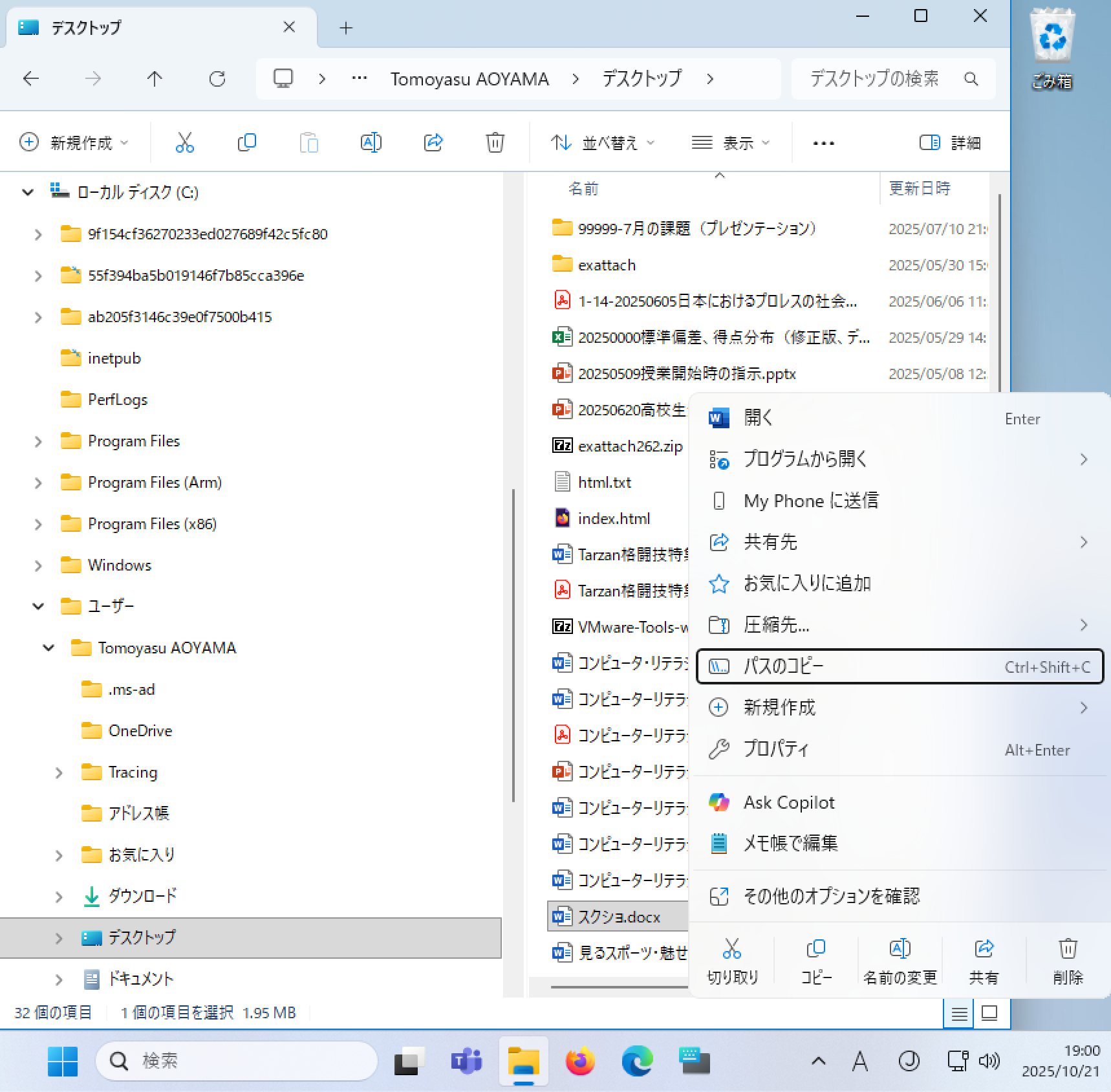 まったく同様に、青山がデスクトップに乱雑に保存・配置した多くのフォルダーやファイルの本当の保存場所は「C:¥Users¥Tomoyasu AOYAMA¥Desktop」である。デスクトップに保存・配置されている個々のファイルの位置、つまり、ファイルのパス(path)は「C:¥Users¥Tomoyasu AOYAMA¥Desktop¥スクショ.docx」のように表記する(¥を半角のバックスラッシュ「\」で表記することもある)。パスはフォルダーやファイルを右クリックすると簡単にコピーできる(以下の右図)。パスを正しく表記したりパスの意味を正しく理解することは、プログラマーやシステムエンジニアにとって必須の知識である。