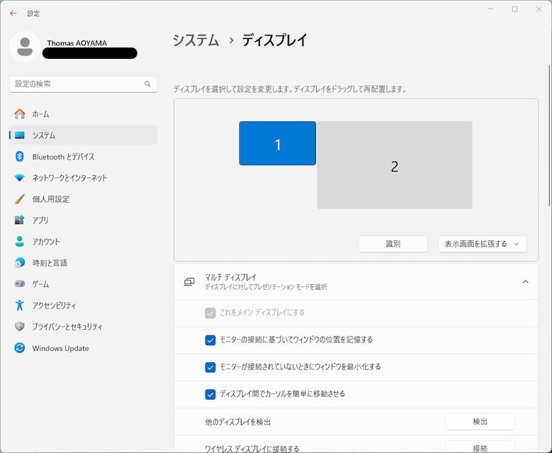 青山のWindowsパソコンに液晶ディスプレイを接続し、拡張モードに変更したあと、「システム-->ディスプレイ」でモニターの接続状況を確認してみた。濃い青色で表示されている小さい[1]の右側に薄い灰色の大きな[2]が表示されている。これは、プライマリーモニター(ノートパソコン=[1])の右側にセカンダリーモニター(液晶ディスプレイ=[2])が配置されているとWindowsは認識している、ということを意味している。パソコン操作がややこしくなるので、もし机上で液晶ディスプレイをノートパソコンの左側に配置している場合には、右側に配置し直すのがよい。「ディスプレイ」設定画面に表示されるモニターの配置は自由に入れ替えることができるので、机上のスペースや実際の作業のしやすさを考慮して、適宜変更してほしい。